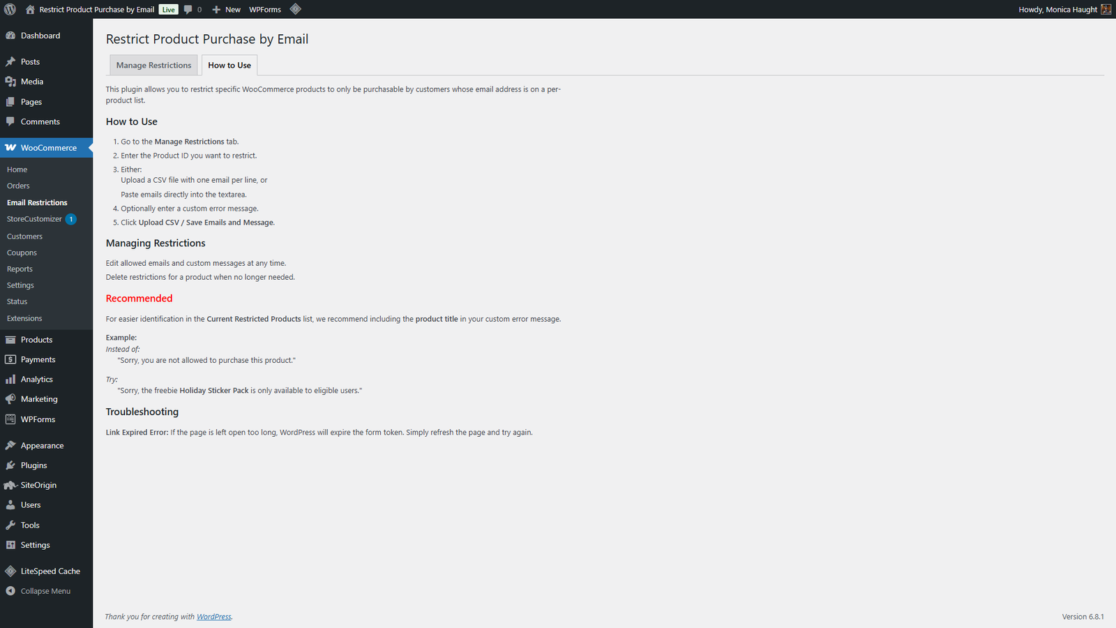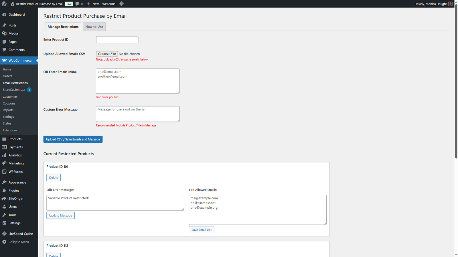 Managing product restrictions has never been easier! The admin interface for Restrict Product Purchase by Email is clean, intuitive, and built right into the WooCommerce menu. You can quickly upload a CSV or paste emails directly, set custom error messages, and view or update all restricted products in one place. Each product has its own management box where you can edit emails, change messages, or remove restrictions with just a click—no technical knowledge required!