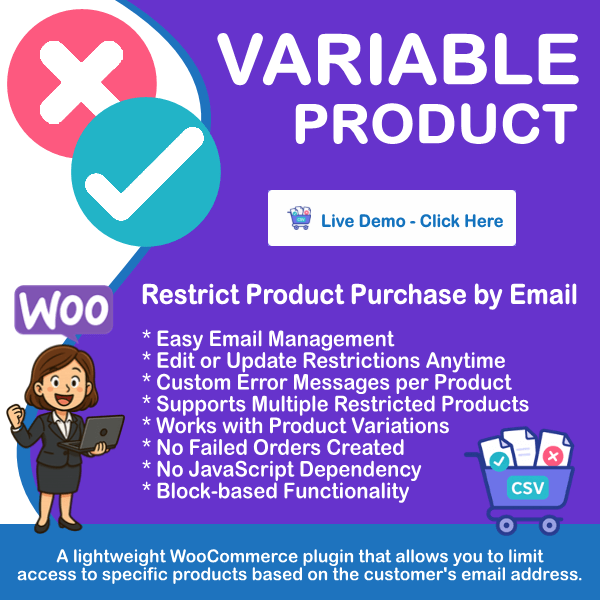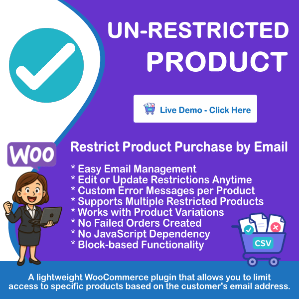 Restrict Product Purchase by Email is a lightweight WooCommerce plugin that allows you to limit access to specific products based on the customer's email address. Perfect for offering exclusive freebies to newsletter subscribers, early access items to crowdfunding supporters, or member-only products, this plugin ensures that only users on an approved email list can complete the checkout process for restricted products.