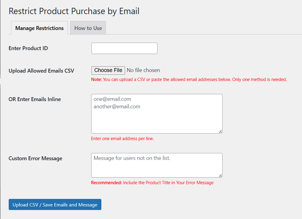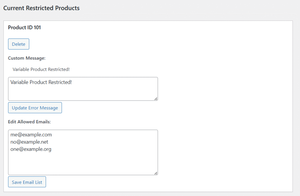 For easier identification in the Current Restricted Products list, we recommend including the product title in your custom error message. While the system uses the product ID behind the scenes, adding the product’s name makes it much easier to recognize and manage your restricted products at a glance— especially when you’re working with multiple restrictions.